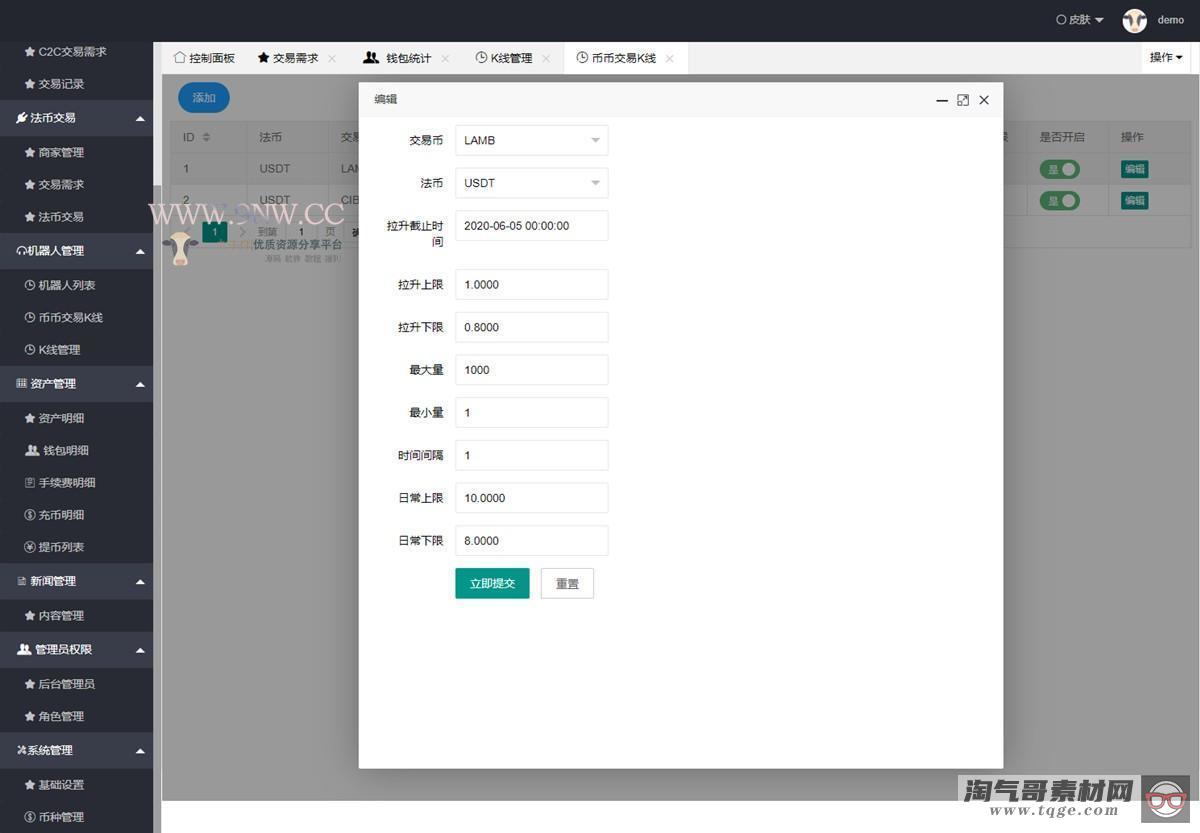淘气哥素材网 » 价值4万的「优化版」数字资产交易所源码|币币交易|C2C交易|交易机器人|撮合交易|合约交易