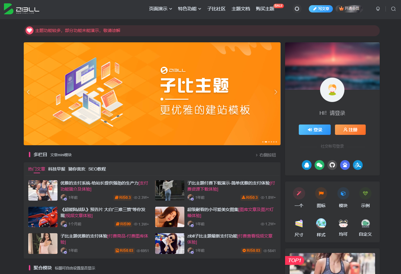 Zibll子比主题专为博客、自媒体、资讯类的网站设计开发,采用简约优雅的设计风格让网站更具美感,创新的前端模块化功能配置和全面的前端用户功能,使子比主题成为更适合现代化网站的优雅主题!