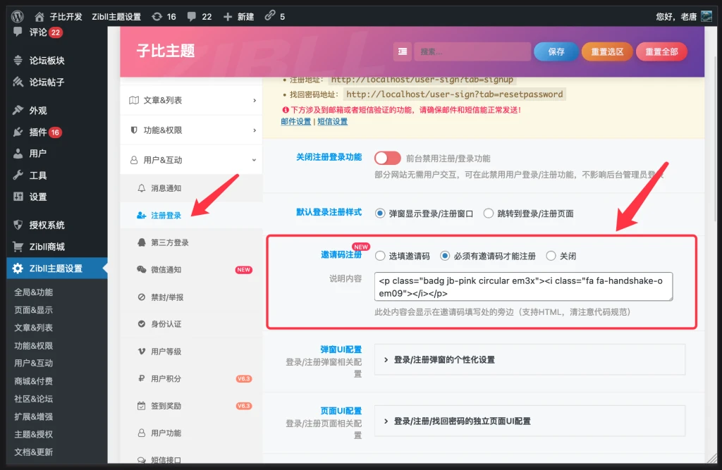 进入主题设置->用户功能->登录注册:开启邀请码注册