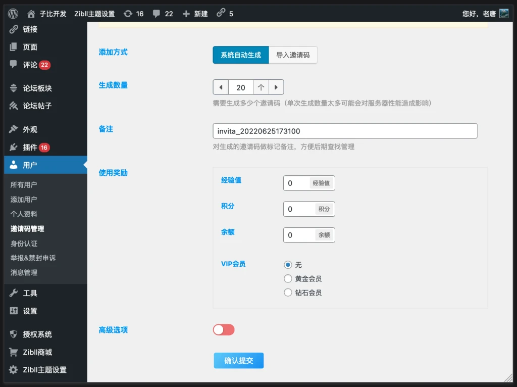 点击添加邀请码,可以选择自动生成邀请码,或导入邀请码。同时可以配置邀请码的使用奖励