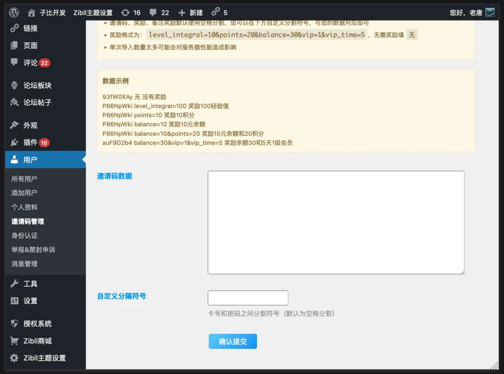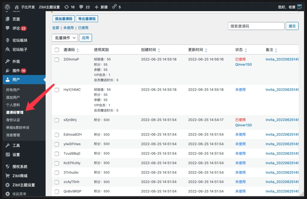 进入用户->邀请码管理:即可查看邀请码列表,也可以添加或导出邀请码
